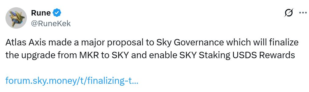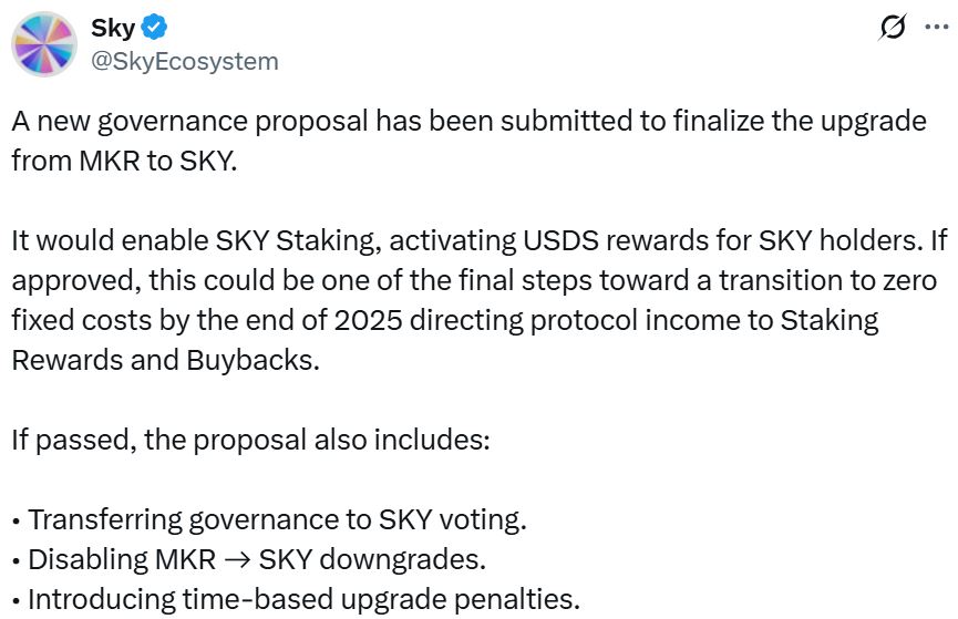 “Пройти повне оновлення MKR до Sky – це одна з останніх творів, відсутніх, перш ніж Sky може перейти до 0 постійних витрат в кінці 2025 року, що забезпечить ще більшу частину доходу, який протокол отримує, виходить на користь викупу Sky, або нагородних нагород”, – сказав він.
