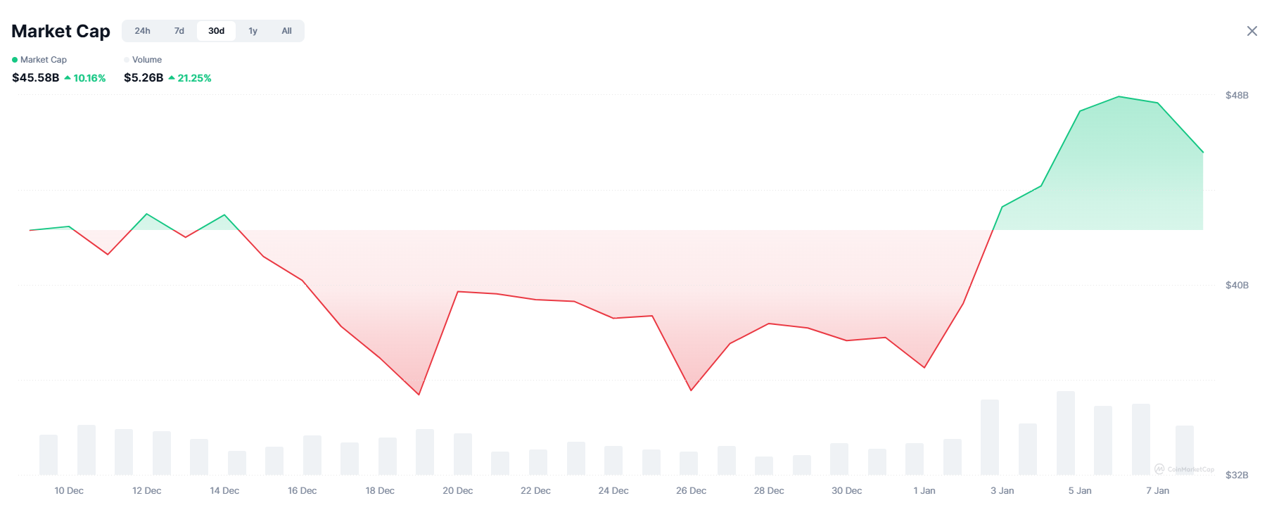 За даними CoinMarketCap, ринкова капіталізація memecoin з тих пір відновилася, перевищивши 47,7 мільярда доларів у понеділок проти 38 мільярдів доларів 29 грудня. Станом на четвер він склав близько 45 мільярдів доларів.