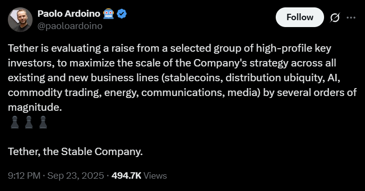 На початку цього тижня генеральний директор Tether Paolo Ardoino підтвердив, що компанія вивчає потенційний збір коштів “з вибраної групи гучних ключових інвесторів”, хоча він відмовився розкривати конкретні імена чи суми.