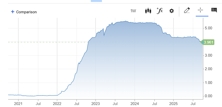 Однак, хоча врожайність залишається історично підвищеною, тримісячна дохідність казначейства зараз знаходиться нижче своїх пікових рівнів з 2023 та 2024 років, що потенційно може сигналізувати про необхідність фірм, багатих на біл.