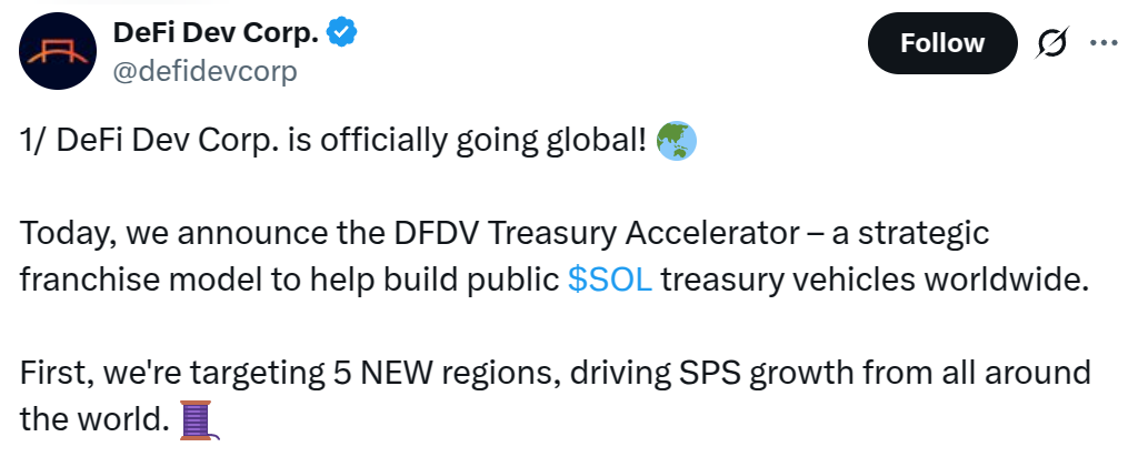 Згідно з оголошенням у четвер, поділеному з Cointelegraph, Defi Development запустив прискорювач казначейства DFDV, Міжнародну ініціативу розширення фірми, яка використовує модель франшизи для підтримки регіональних казначейства Солани у всьому світі.