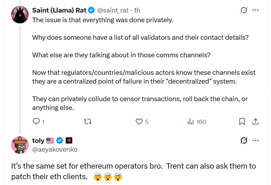 “Чому у когось є список усіх валідаторів та їх контактні дані? Про що ще вони говорять у цих каналах Comms”, – запитали вони, побоюючись, що вони можуть змогти потенційно цензурувати транзакції або відкочити ланцюг.