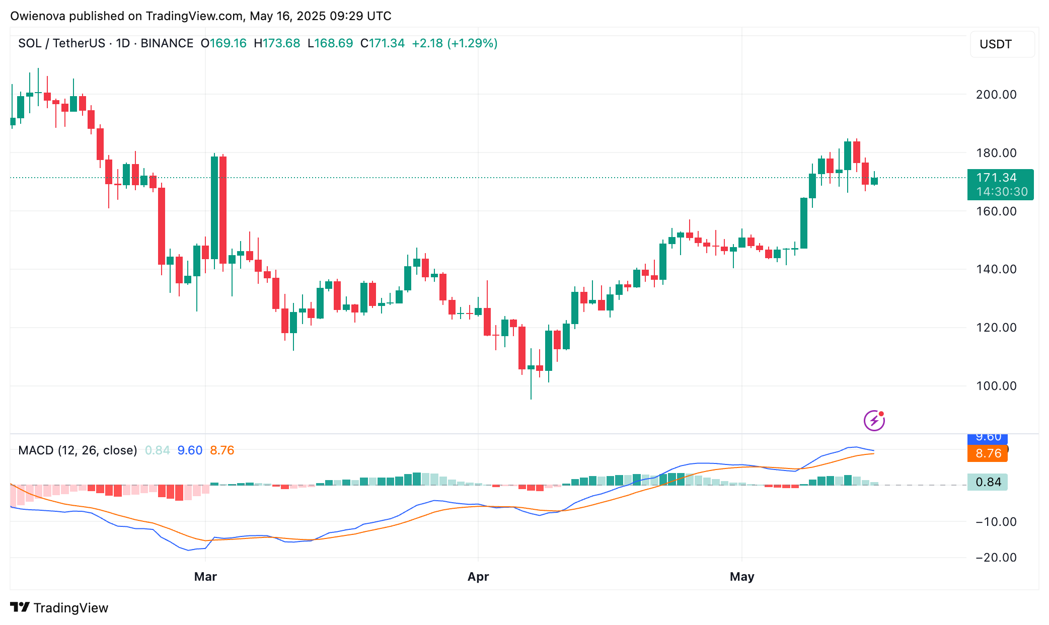 Sol Trading на рівні 171 долара на графіку 1D |Джерело: Solusdt на TradingView.com