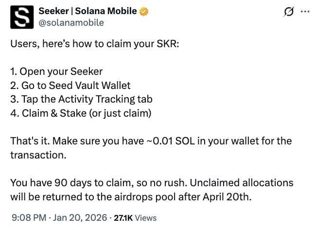 Користувачі смартфона Solana Seeker мають 90 днів, щоб отримати токени SKR у рамках еірдропу, які можна поставити, щоб отримати винагороду.
