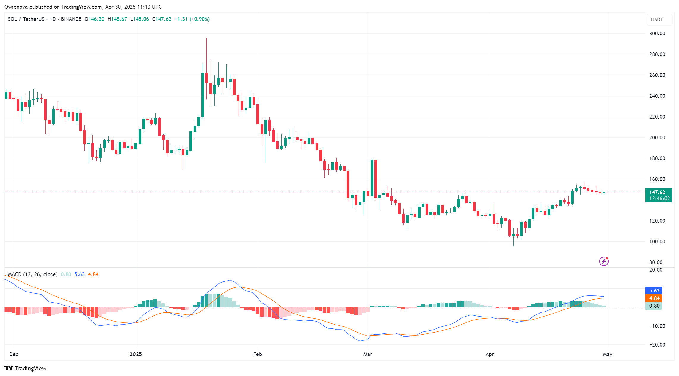 СоланаSol Trading на рівні 147 доларів на графіку 1D |Джерело: Solusdt на TradingView.com