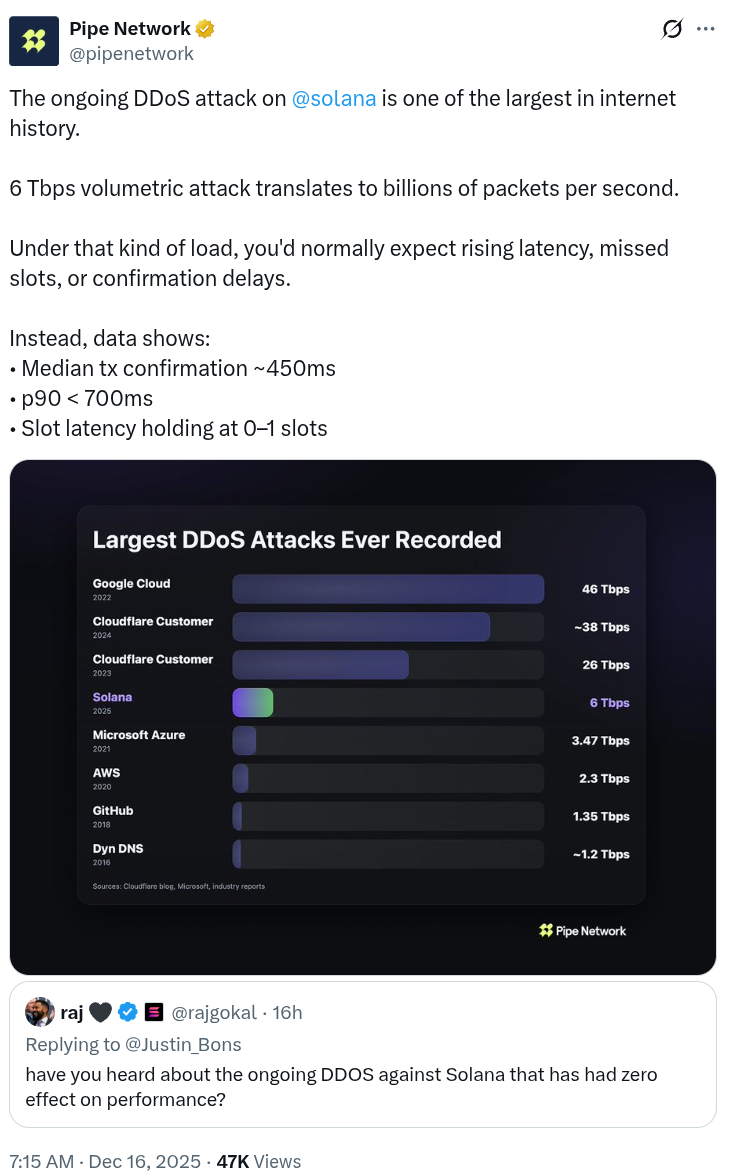 Також у вівторок Девід Родус, генеральний директор проекту Pipe Network децентралізованої мережі фізичної інфраструктури (DePIN) на базі Solana, зазначив, що спільна метрика робить атаку «промисловим масштабом». В оновленому оновленні Pipe Petwork також стверджувала, що атака була «однією з найбільших в історії Інтернету», оскільки шість Тбіт/с «перетворюються на мільярди пакетів на секунду».