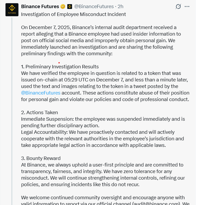 У дописі X біржа повідомила, що її аудиторська група отримала звіт, в якому стверджувалося, що співробітник використовував закриту інформацію для створення публікації в офіційному обліковому записі Binance Futures X «менш ніж через хвилину» після випуску токена в ланцюжку.