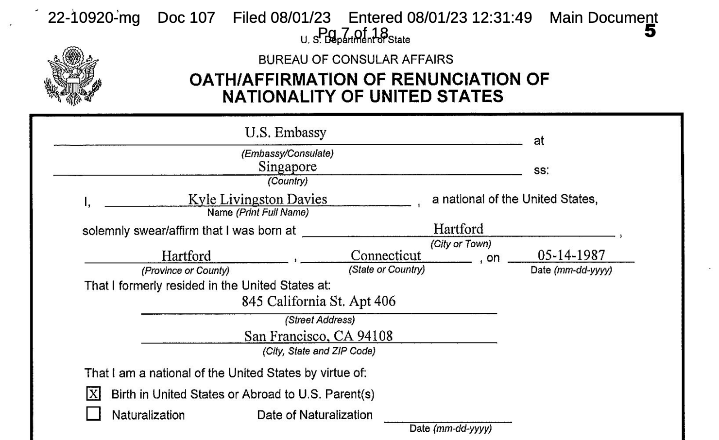 У заяві, поданій 1 серпня до суду США з питань банкрутства Південного округу Нью-Йорка, Девіс надав нотаріально завірені та апостильовані копії форми заяви про відмову від свого громадянства США 15 грудня 2020 року. Він стверджував, що отримав громадянство Сінгапуру. після видачі паспорта в січні 2021 року та не «підпорядковувався судам Сполучених Штатів або визнав їхню юрисдикцію».
