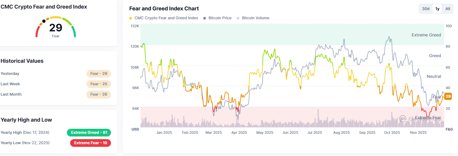 Після рекордного обвалу ринку на початку жовтня апетит інвесторів у криптовалюту залишається приглушеним щодо більшості криптовалют, не лише щодо мемкойнів. Згідно з індексом страху та жадібності CoinMarketCap, настрої криптовалютних інвесторів трохи відновилися після «Надзвичайного страху» 10, зафіксованого 23 листопада, але поточні показники 29 все ще вказують на «Страх» і залишаються набагато нижче рівня 62 «Жадібність» від 7 жовтня, до того як стався обвал криптовалютного ринку на 19 мільярдів доларів.
