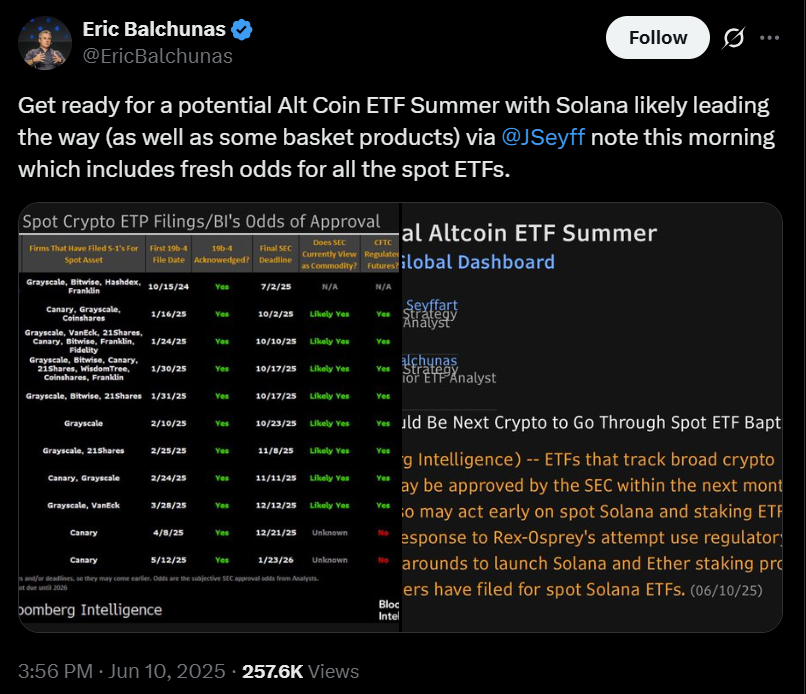 Старший аналітик ETF Bloomberg Ерік Балчунас зазначив у червні, що до липня було схвалено кілька таких фондів, причому Солана, ймовірно, “лідирує”.