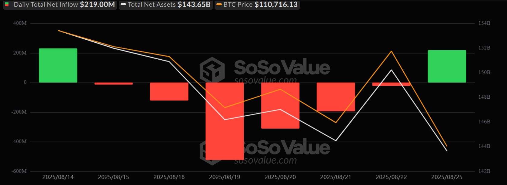 Стокові фонди біржових бірж (ETF) закінчили шестиденну смугу чистих відтоків у понеділок, щоденно 219 мільйонів доларів.
