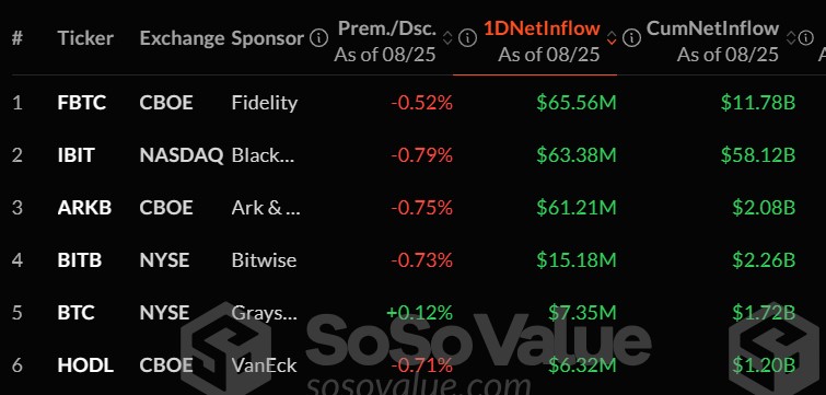 Ishares Bitcoin Trust (IBIT) дотримувався 63,38 мільйонів доларів, тоді як Ark Invest’s Ark 21Shares Bitcoin ETF (ARKB) додав 61,21 мільйона доларів.