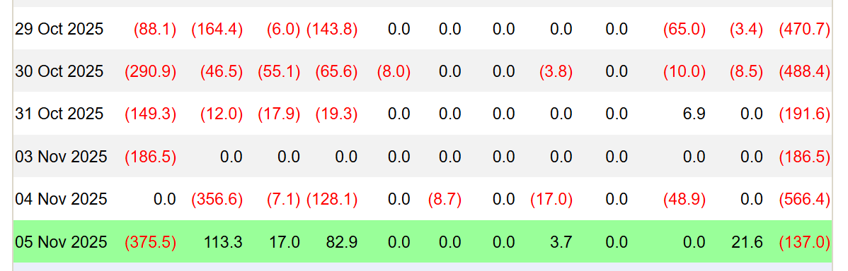 Ця серія, що почалася 29 жовтня, наразі стерла загалом понад 2,04 мільярда доларів. Найважчий день припав на вівторок, коли інвестори залучили 566 мільйонів доларів після попередніх сесій на 470, 488 та 191 мільйони доларів.