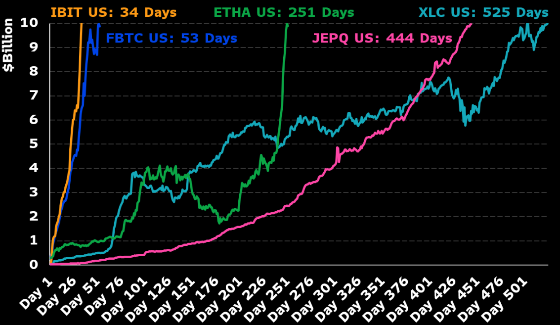 Президент Novadius Wealth Management Nate Geraci заявив, що три найшвидші ETF, які потрапили в позначку в розмірі 10 мільярдів доларів, зараз є всіма точковими ETF криптовалютою, підкреслюючи їх безпрецедентну швидкість зростання порівняно з традиційними фінансами.
