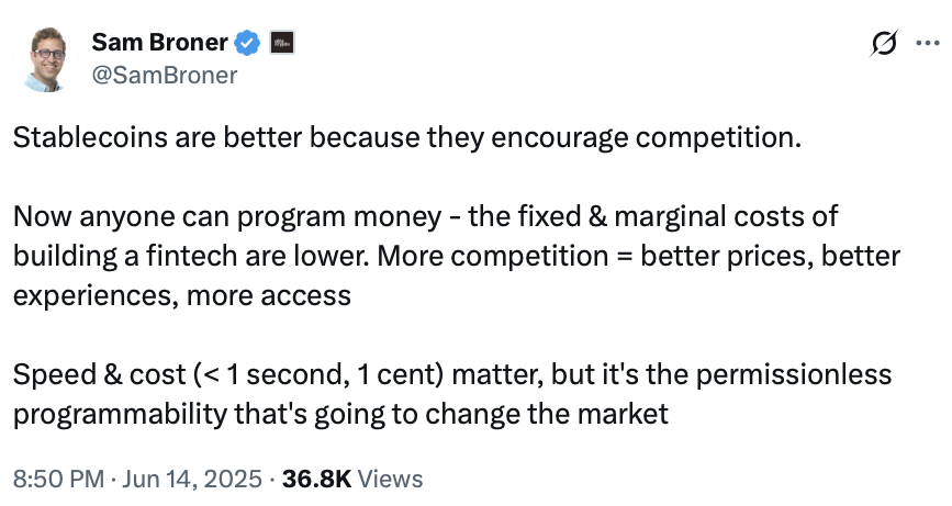 “Тепер будь -хто може програмувати гроші – фіксовані та граничні витрати на створення Fintech нижчі. Більше конкуренції = кращі ціни, кращий досвід, більший доступ”, – додав Бронер.