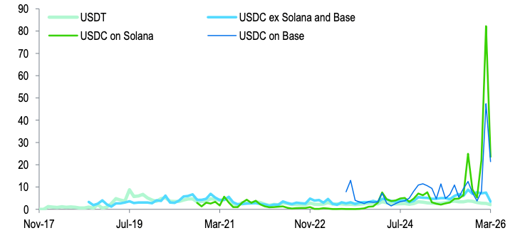 Різкий сплеск швидкості стейблкойна, який досягає обороту в середньому щонайменше шість разів на місяць, був зумовлений головним чином USDC Circle (USDC), другим за величиною стейблкойном за ринковою капіталізацією після USDt Tether (USDT).