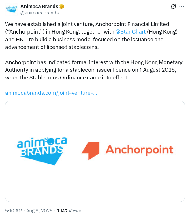 Згідно з оголошенням у п’ятницю від брендів Animoca, дві фірми спільно встановили AnchorPoint Financial Limited у Гонконзі, щоб подати заявку на місцеву ліцензію емітента StableCoin. Новому дочірньому дочірньому підприємству буде покладено завдання створити бізнес -модель, орієнтовану на видачу та просуванні ліцензованих стабільців.