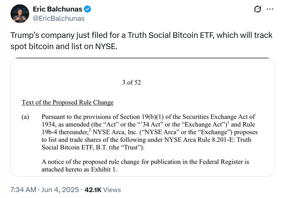 Фондова біржа NYSE ARCA подала на The Truth Social Bitcoin ETF з Комісією з цінних паперів та бірж 3 червня від імені менеджера активів криптовалют Yorkville America Digital, партнера власника Trump Media & Technology Group.