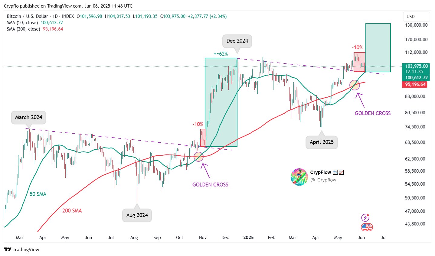 Аналіз Cypflow свідчить про те, що якщо біткойн повторює свою цінову ралі від Q4 2024, прем’єрна криптовалюта може призвести до 62% приріст цін на потенційні цілі близько 170 000 доларів. Однак аналітик встановив більш консервативну початкову цінову ціну в розмірі 130 000 доларів, що становить 25% прибутку від поточних рівнів ринку.