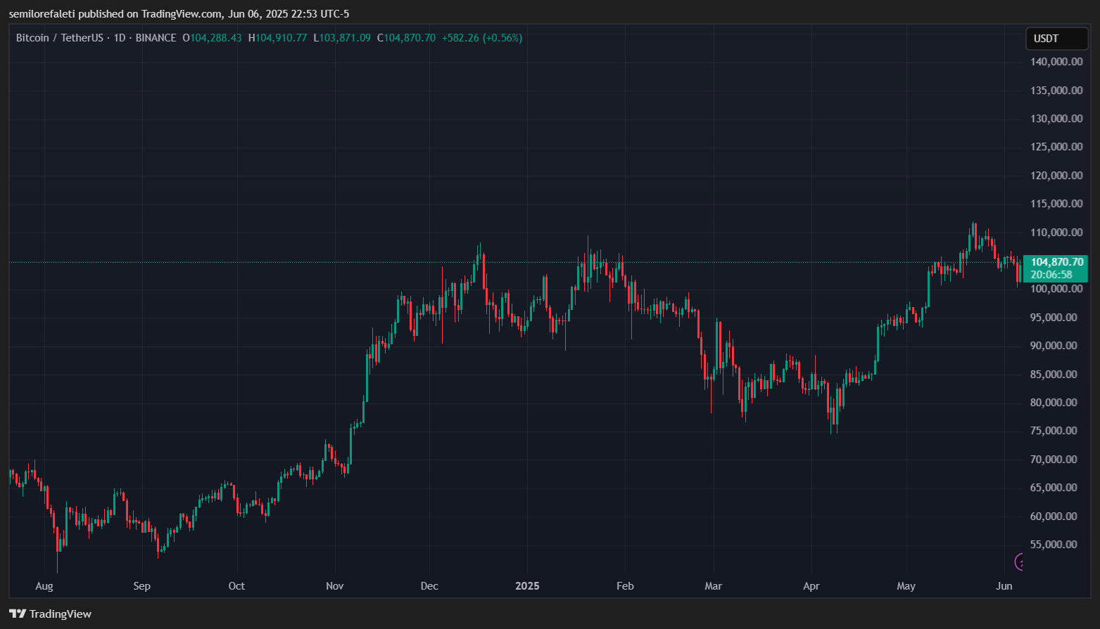 BTC Trading на рівні 104 870,70 доларів на щоденній торговій діаграмі |Джерело: діаграма BTCUSDT на TradingView.com