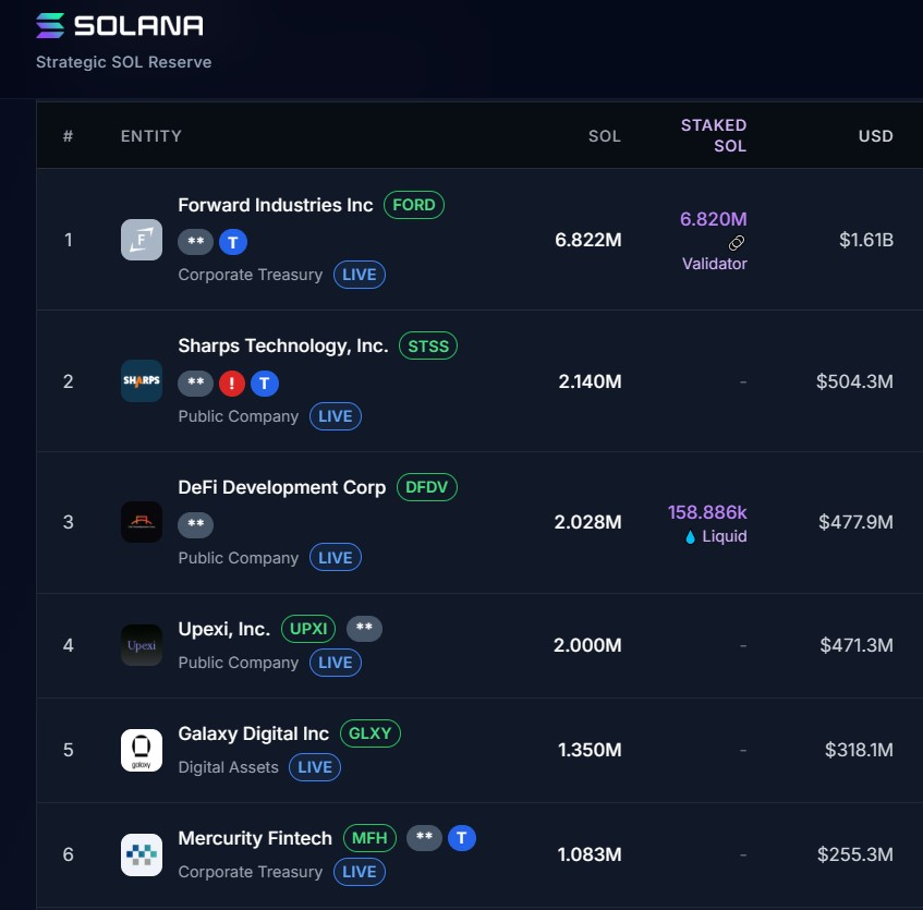 Найбільший учасник – форвардна галузя, яка має понад 6,8 мільйона SOL, вартістю 1,61 мільярда доларів. Інші фірми, такі як Sharps Technology, Defi Development Corp. та Upexi, мають приблизно 2 мільйони SOL, при цьому індивідуальні розподіли перевищують 400 мільйонів доларів.