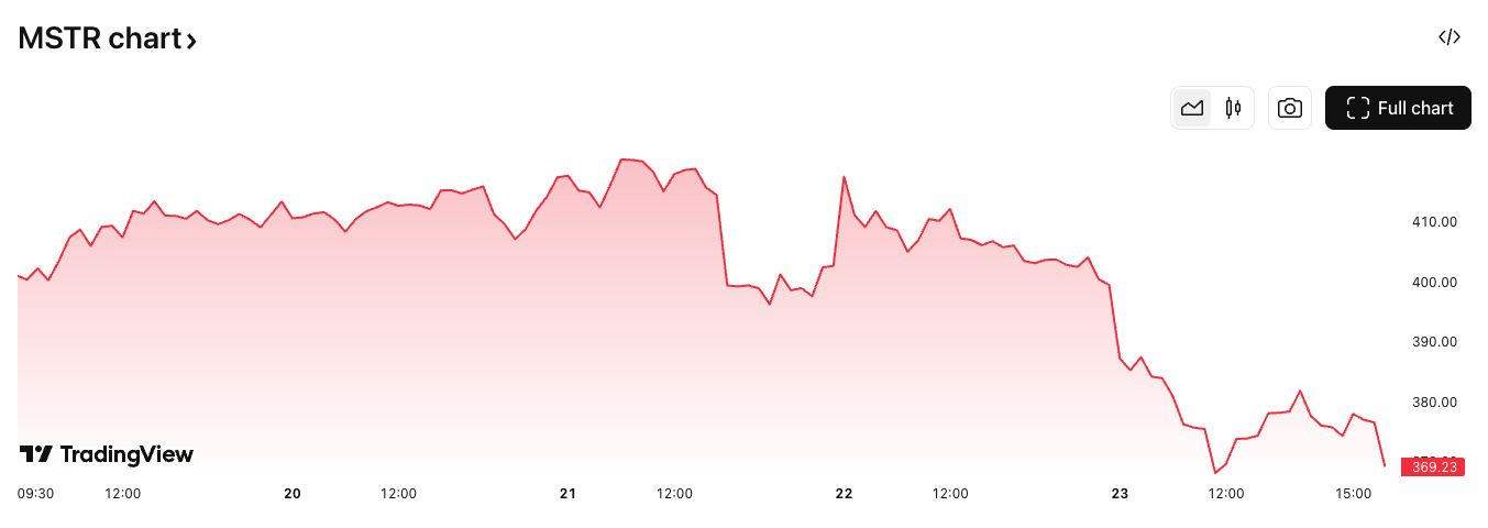 Тим часом акції стратегії нещодавно впадають у свої найвищі максимуми, втрачаючи щонайменше 12% за останній тиждень, ціни знизилися з приблизно 420 до 369 доларів, згідно з даними TradingView.