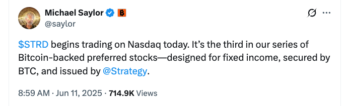 Оголошення надходить незабаром після того, як третій перевагу стратегії, що підтримується біткойнами, STRD, почав торгувати на NASDAQ 11 червня.