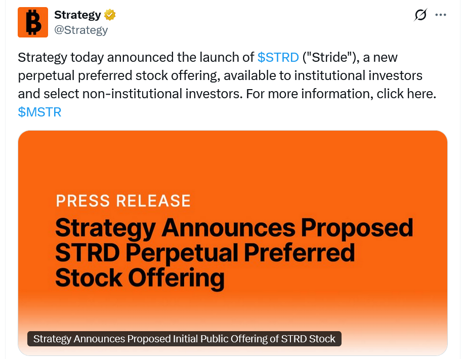 Стратегія має намір видати 2,5 мільйона акцій своїх 10% серії A Perfement Stride Preferred, з Ticker STRD, за 100 доларів за акцію, повідомляє фірма-біткойн-фірма у заяві 2 червня.