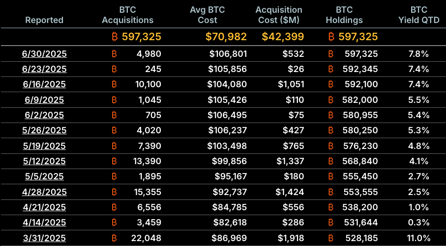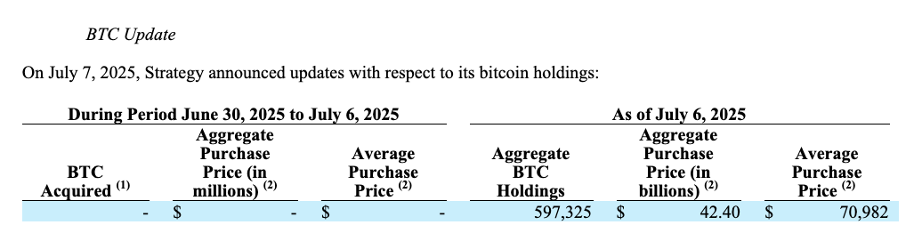 Рішення стратегії пропустити покупки Bitcoin прийшло, коли ціни впали до 105 400 доларів минулого вівторка, перш ніж коротко зросли на 110 000 доларів 3 липня, згідно з даними Coingecko.