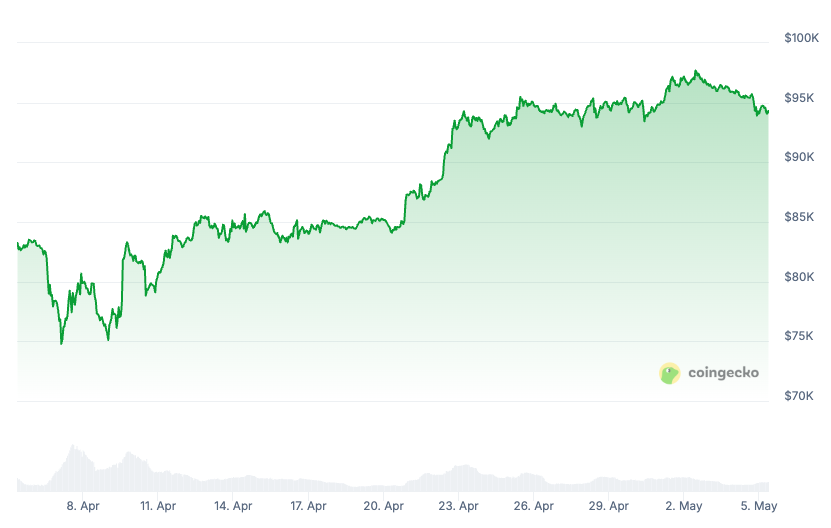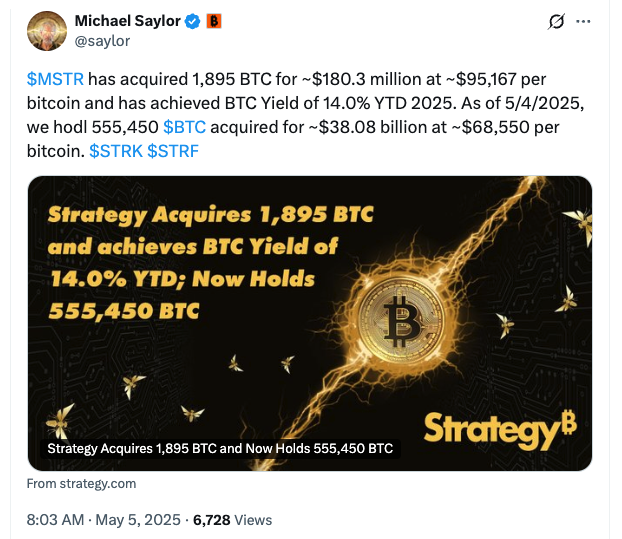Стратегія придбала нову партію в розмірі 1895 біткойна (BTC) за 180,3 мільйона доларів протягом тижня з 28 квітня по 4 травня за середньою ціною 95 167 доларів за BTC, фірма оголосила в останній поданні форми 8 до Комісії з цінних паперів та бірж США.