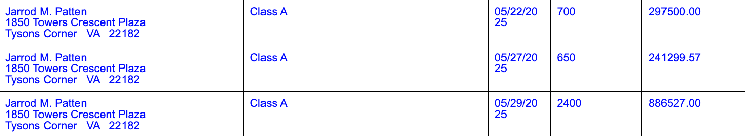 Відповідно до звіту про стратегію запропонованого продажу цінних паперів, поданих 30 травня, Паттен продав 3750 акцій за період між 22 та 29 травня, вартістю майже 1,4 мільйона доларів.