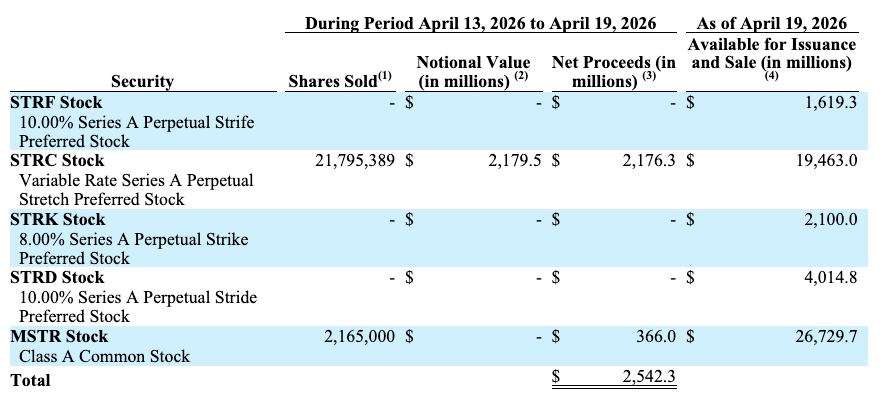 Згідно з заявою, STRC принесла 2,18 мільярда доларів США, або близько 85,7% від загального доходу, тоді як продаж звичайних акцій класу А (MSTR) склав 366 мільйонів доларів США.