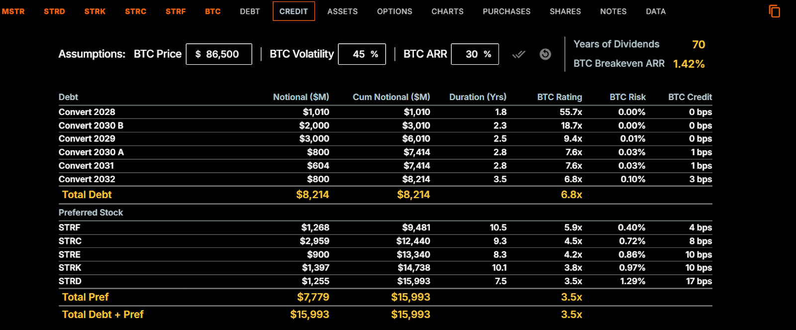 Strategy, найбільший у світі корпоративний власник біткойнів (BTC), випустив новий кредитний рейтинг Dashboard на основі національної вартості привілейованих акцій компанії та стверджує, що має ще 70 років виплати дивідендів для обслуговування свого боргу, якщо ціна біткойна залишиться незмінною.