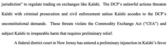 Днем пізніше Kalshi подав до суду на DCP, стверджуючи, що його контракти на події «є законними згідно з федеральним законом», а його платформа підпадає під «виключну юрисдикцію» Комісії з торгівлі товарними ф’ючерсами, і в п’ятницю подав клопотання про тимчасове припинення дії DCP.