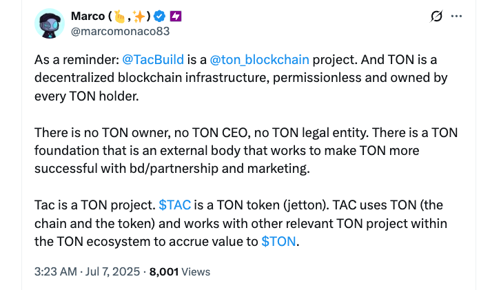 За словами співзасновника TAC Marco Monaco, TAC-це проект, побудований на Ton, який має власний маркер Jetton Ton і працює з іншими проектами в екосистемі Ton, щоб “накопичити цінність до тонни”.