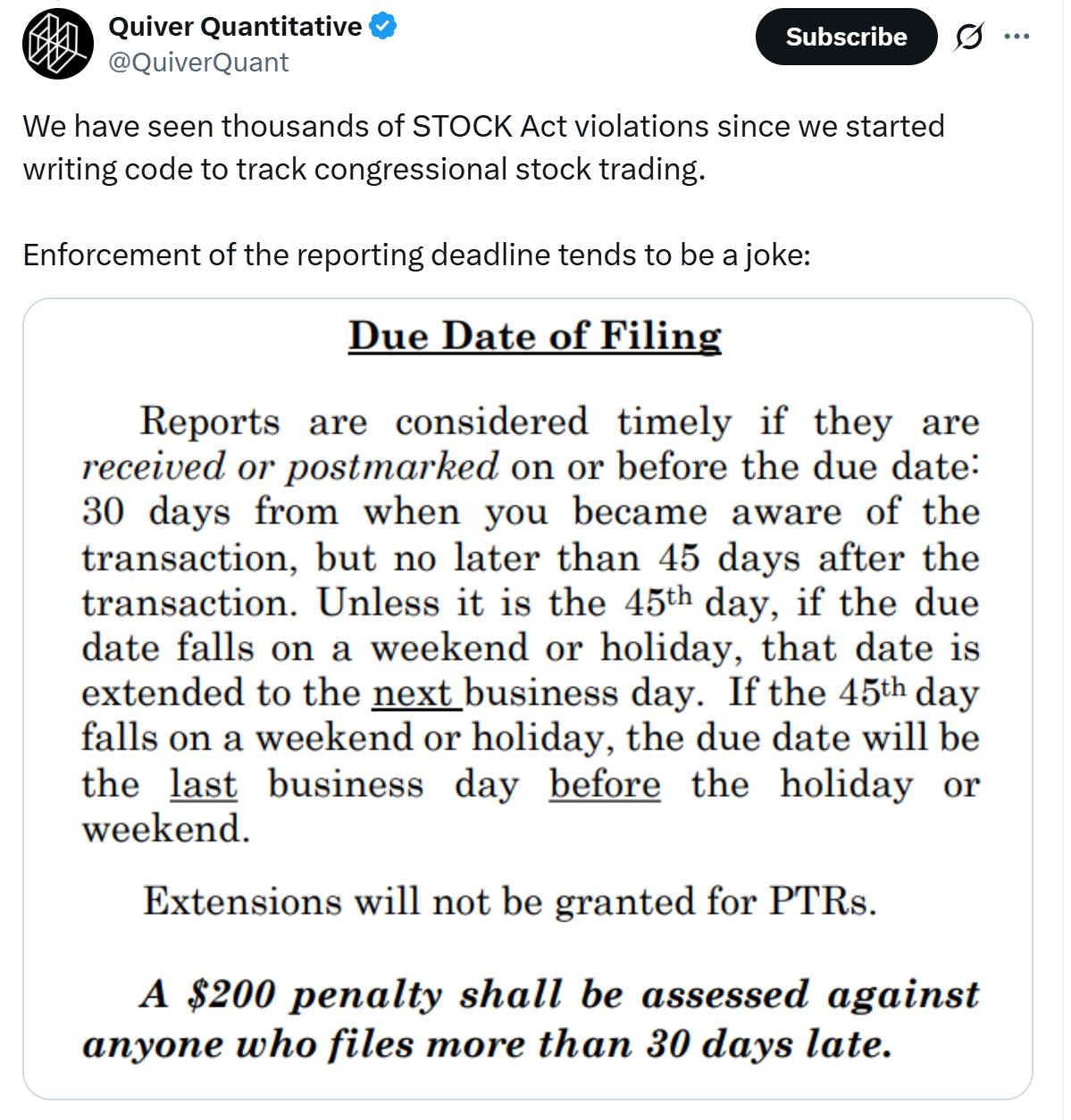 Зокрема, штраф для подання закону про пізні акції, як правило, становить лише 200 доларів. У штату 2 червня на X, інвестиційна дослідницька фірма Quiver Quantitative назвала пенальті “жарт”.