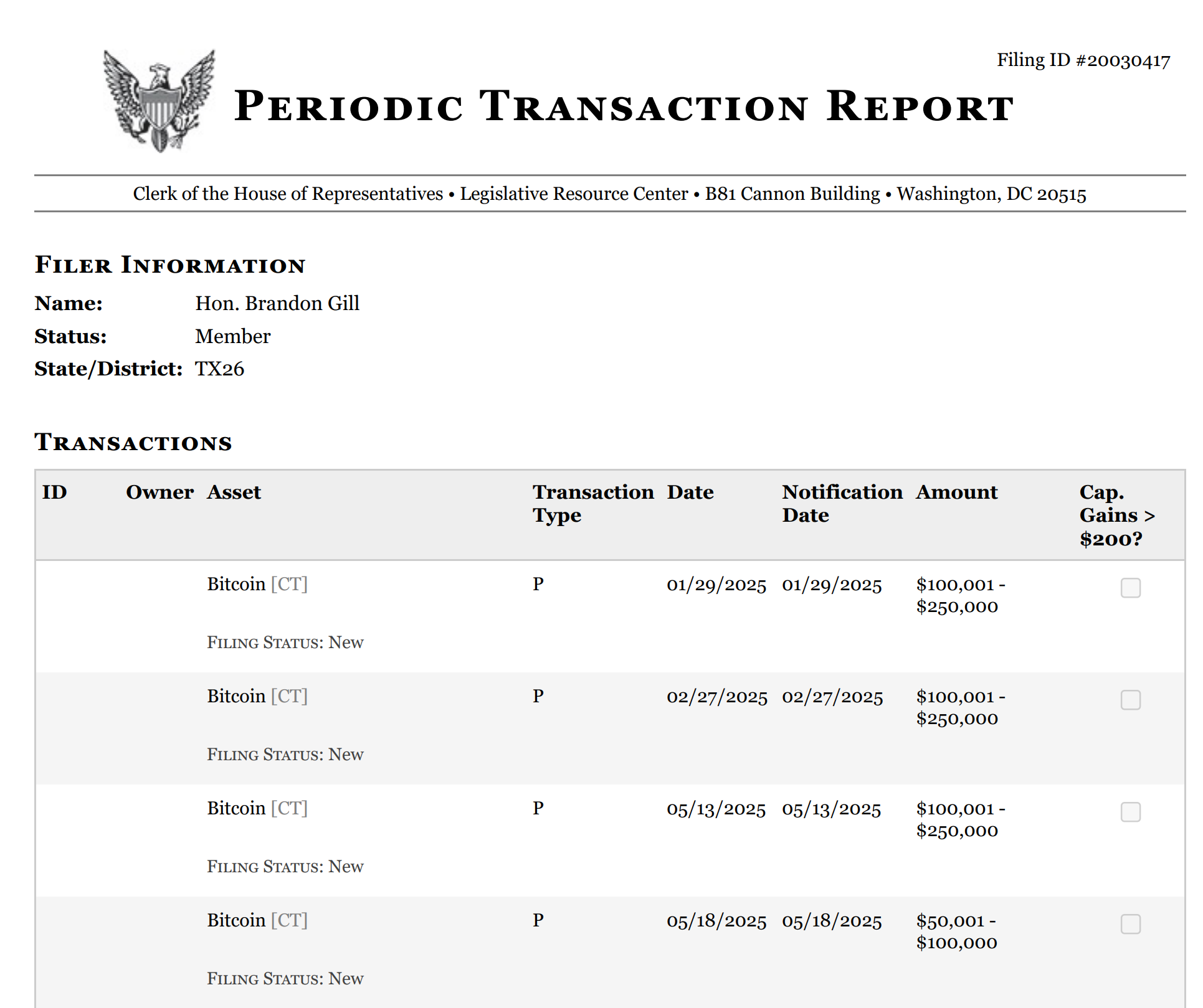 Техаський республіканський представник Брендон Гілл зіткнувся з ретельним контролем після подання пізніх розкриттів до 500 000 доларів США на покупки біткойна, потенційно порушуючи федеральний закон.