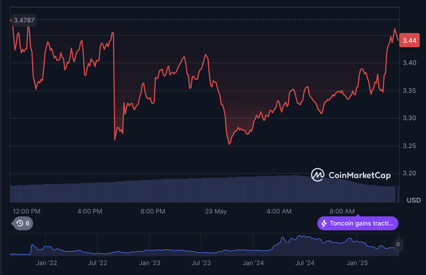 Toncoin (Ton), єдиний цифровий актив Telegram, прийнятий до послуг додатків, збільшився на понад 20% до 3,69 долара 28 травня, після оголошення про партнерство.