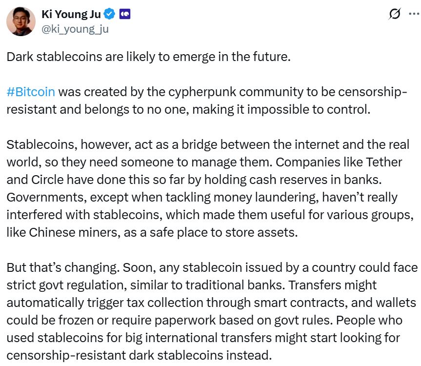 Стаблекони використовувались для різних груп для зберігання активів через відсутність втручання уряду;Однак, з урахуванням правил, які незабаром можуть змінитися, Кі Янг Джу, генеральний директор фірми Crypytics Crypytics Crypoquant, заявив у пост 11 травня.