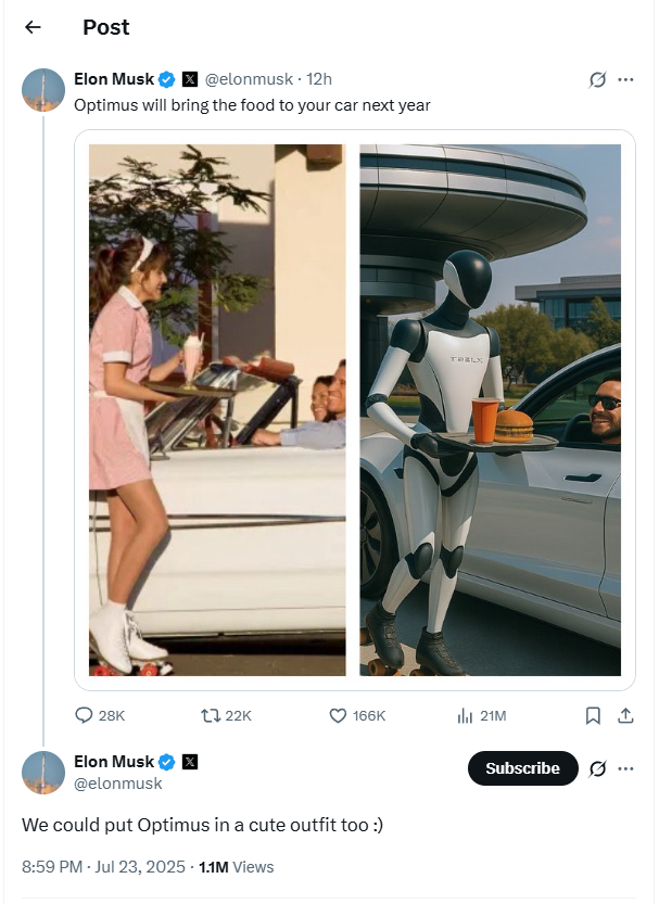 Тим часом, генеральний директор Tesla Елон Маск заявив на X, що він може модернізувати робочу силу роботів у новокритій ретро-тематиці Tesla Diner в наступному році, в комплекті з «милими» нарядами.