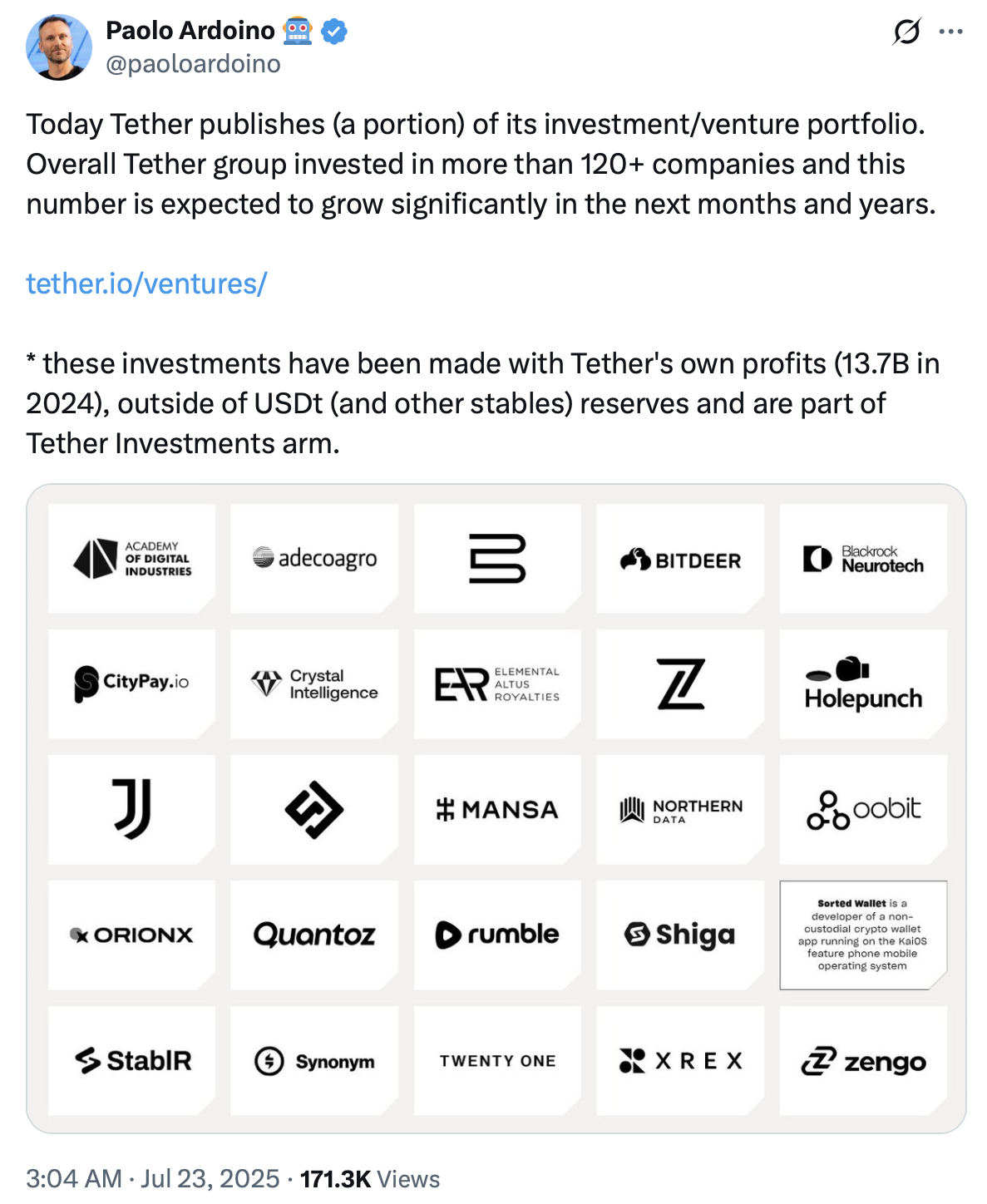 Генеральний директор Паоло Ардоіно заявив у липні, що Tether інвестував у понад 120 компаній через свій венчурний підрозділ, причому ці інвестиції фінансувалися з прибутку компанії, а не з резервів стейблкойнів.