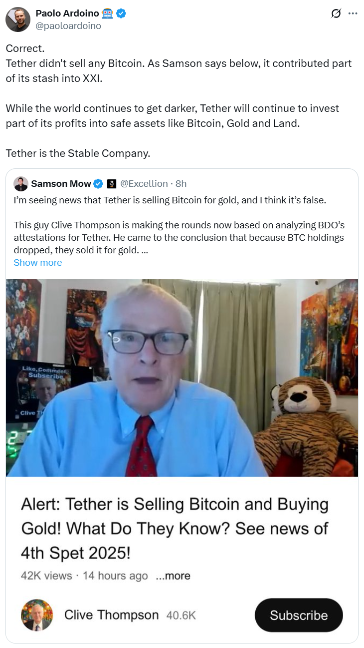Зауваження надійшло у відповідь на спекуляції YouTuber Clive Thompson, який цитує дані Attestation Tether’s Q1 та Q2 2025 з BDO, щоб стверджувати, що фірма зменшила свою позицію Bitcoin (BTC). Томпсон вказав на падіння з 92 650 BTC у Q1 до 83 274 BTC у Q2 як свідчення продажу.