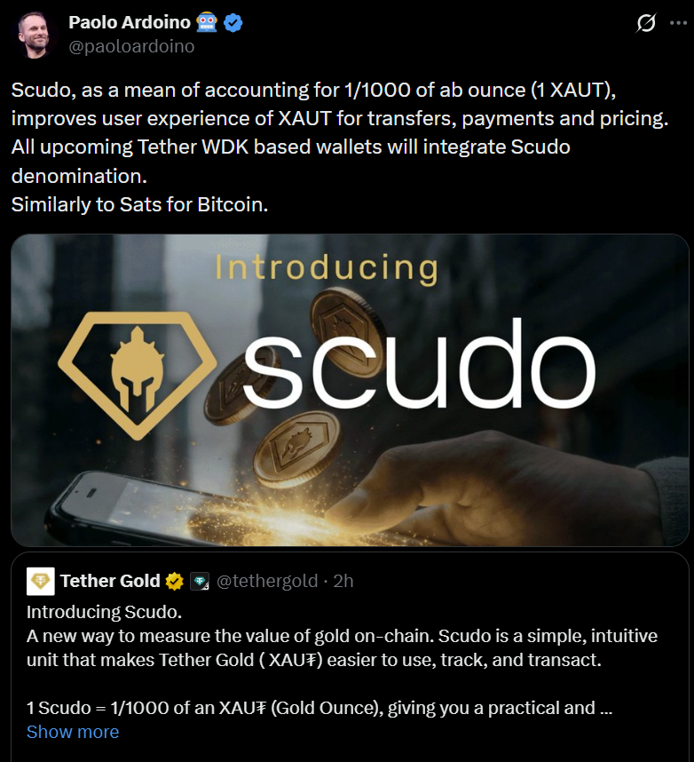 Tether сказав, що впровадження Scudo покликане зробити володіння золотом більш доступним. Хоча золото довгий час вважалося надійним засобом збереження вартості, пряме володіння історично обмежувалося питаннями зберігання, зберігання та подільності.