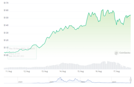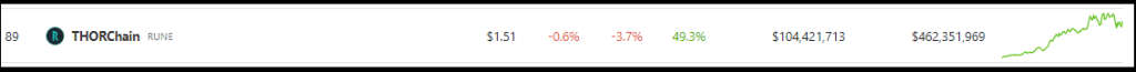 Згідно зі статистичними даними Coingecko, ціна THORChain наразі становить 1,54 долара, що відображає зростання на 50% за останні сім днів. Однак за останні 24 години він впав на 3,7%.