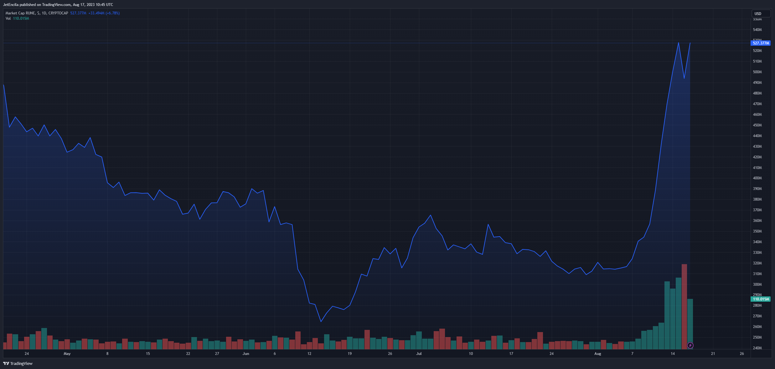 Сьогодні ринкова капіталізація RUNE досягає 527 мільйонів доларів. Графік: TradingView.com