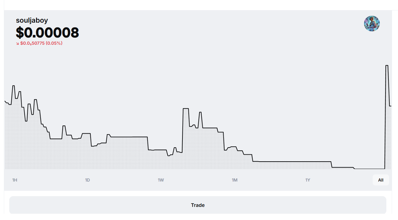 Новий токен Soulja Boy (SOULJABOY) не набув великої популярності. Згідно з даними додатку Base, з моменту запуску в п’ятницю токен накопичив ринкову капіталізацію в 85 000 доларів і отримав інвестиції від 331 власника.