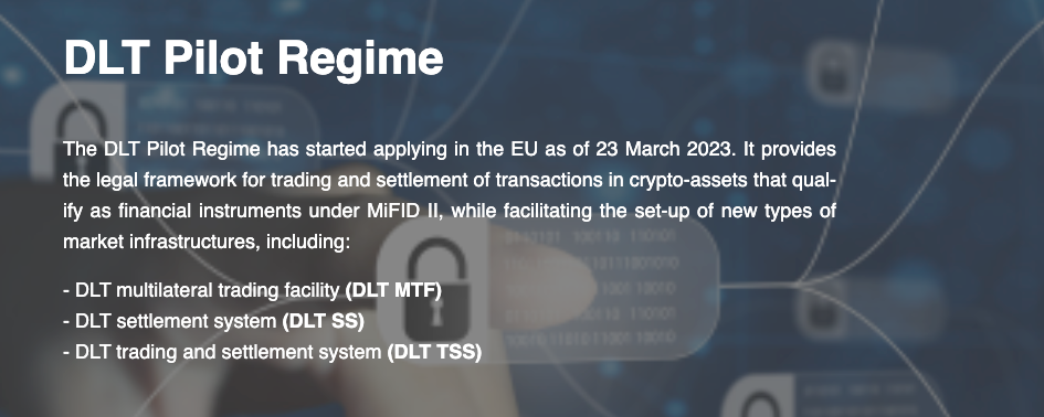 Пілотний режим DLT, який набув чинності в березні 2023 року, забезпечує правову основу для торгівлі та розрахунків за операціями з криптовалютними активами, які кваліфікуються як фінансові інструменти відповідно до Директиви про ринки фінансових інструментів (MiFID II).