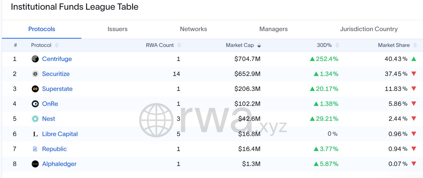 Securitize слідкував за 652 мільйонами доларів на 14 токенізованих IAF, що становить 37,5% ринку. Інші помітні протоколи включали Superstate з 206 мільйонами доларів та ONRE – 102 мільйони доларів вартості фонду.