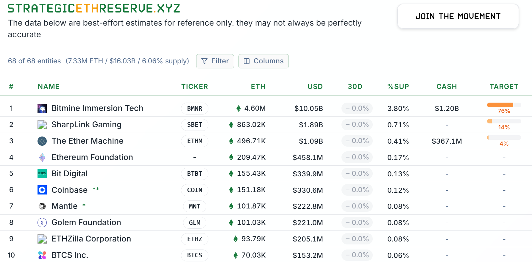 Bitmine і Exodus Movement — єдині дві казначейські компанії Ether, які публічно оприлюднили інвестиції в Ether за останні 30 днів.