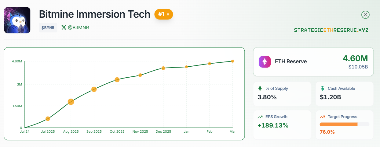 Bitmine зібрав приблизно 3,86% від загального обігу в 120,6 мільйона з моменту оголошення про свою криптовалюту вісім місяців тому.